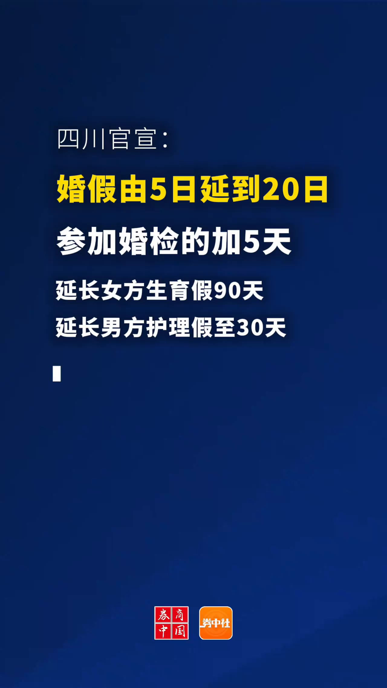 四川官宣:婚假由5天延长到20天,延长女方生育假90天,延长男方护理假至30天