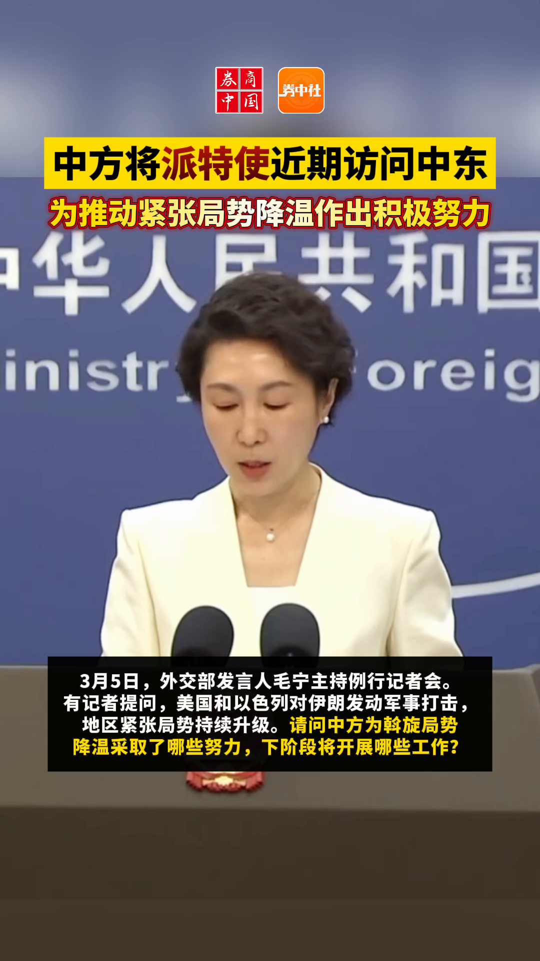 【中方将派特使访问中东】在今天的外交部例行记者会上,发言人毛宁表示,中方对当前中东地区紧张局势深表关切,近日中方立即开展斡旋工作,王毅外长分别同俄罗斯、伊朗、阿曼、法国、以色列、沙特、阿联酋等国外长通电话,就地区局势深入交换意见,强调应遵守联合国宪章宗旨和原则,反对在国际关系中动辄使用武力,指出必须立即停止军事行动,尽快重回对话谈判,避免紧张局势进一步升级,战火进一步蔓延。冲突当事方应切实履行国际义务,保障平民安全,避免攻击民用设施,战事延宕冲突升级不符合任何一方的利益。中方认为战争和武力无法从根本上解决问题,对话谈判才是解决问题的正确路径。应该坚持通过政治外交手段化解矛盾分歧。中方将继续同包括冲突当事方在内的有关各方保持沟通,加强斡旋,凝聚共识。中方将派中国政府中东问题特使翟隽于近期访问中东地区,为推动紧张局势降温作出积极努力。