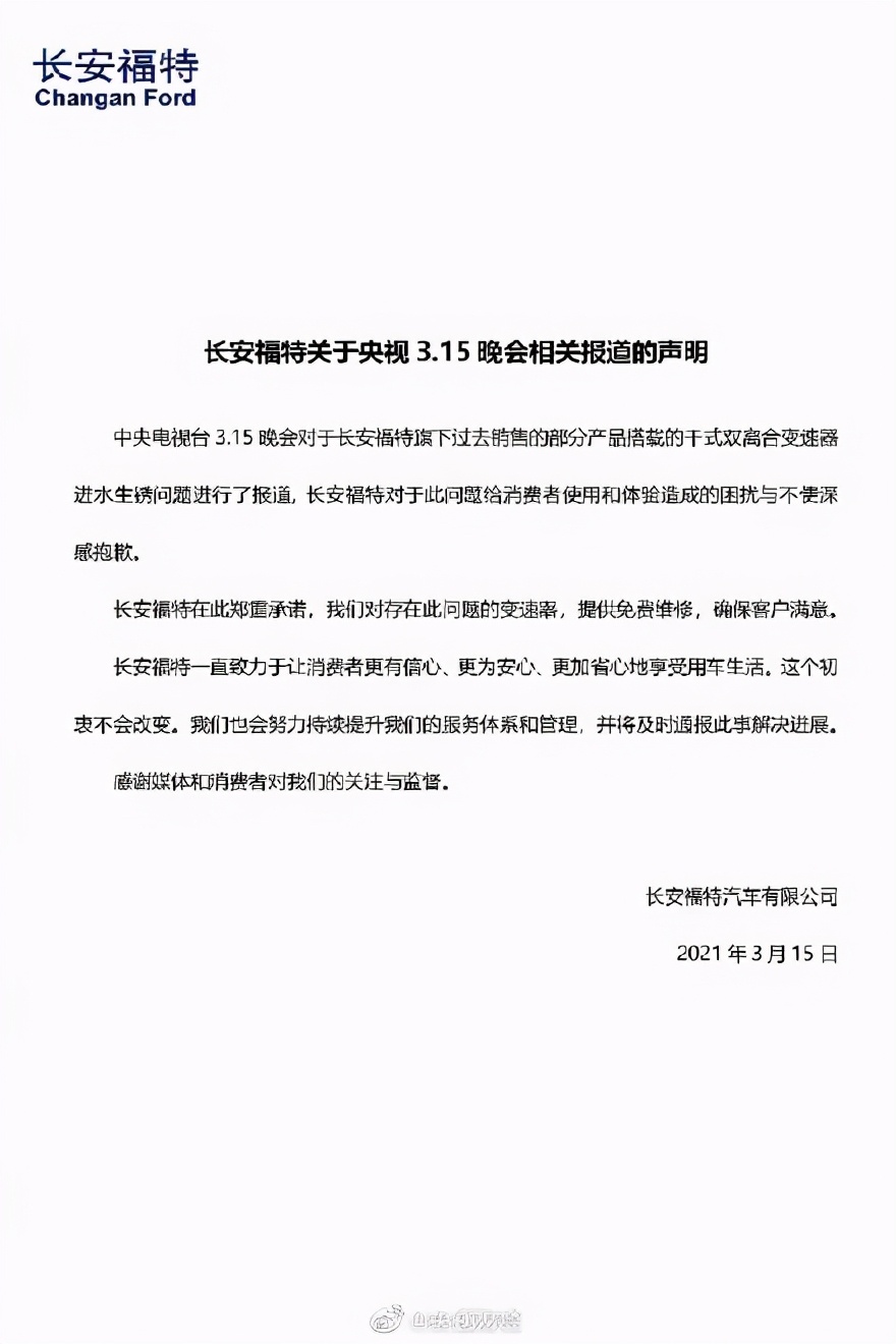 315曝光之后,长安福特发布关于央视3.15晚会相关报道的声明。中央电视台3.15晚会对于长安福特旗下过去销售的部分产品搭载的干式双离合变速器进水生锈问题进行了报道, 长安福特对于此问题给消费者使用和体验造成的困扰与不便深感抱歉。长安福特在此郑重承诺,我们会努力持续提升我们的服务体系和管理,并将及时通报此事解决进展。