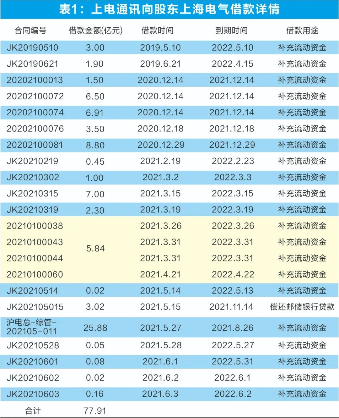 证券时报记者获取的文件显示,上海电气2019年5月10日~2021年5月28日分19次向上电通讯借款(或委托借款)77.66亿元,爆雷事件后的6月1日~3日又有3笔合计2570万元的借款,借款用途几乎全部是“补充流动资金”(表1)。