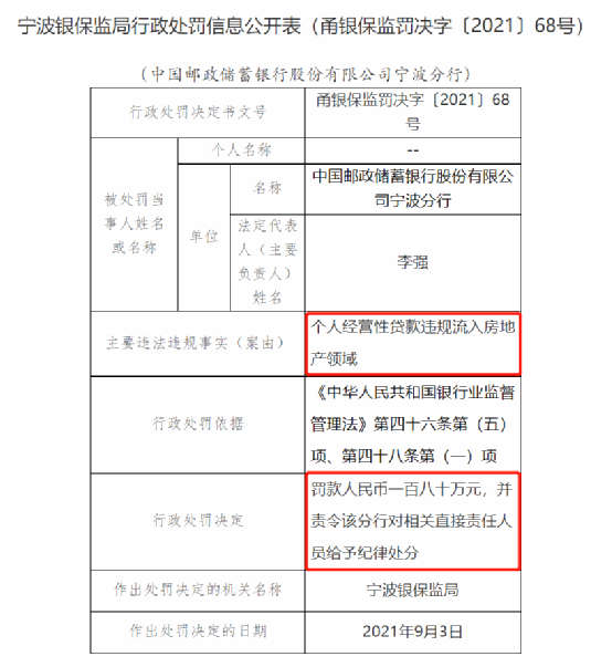 其中,邮政储蓄银行宁波分行被罚180万元,浙商银行宁波分行和宁海农村商业银行分别被罚160万元和150万元。