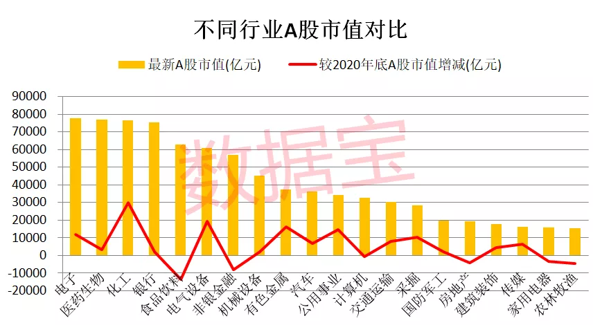 2020年度的市值冠军食品饮料跌落至第五位,化工行业反超,由去年底的第六位升至第三位。有色金属行业市值排名由第十三位升至第九位。与去年底相比,化工行业A股市值增长最为显著,今年以来累计增长3万亿。有色、采掘行业A股市值增长也在万亿规模。