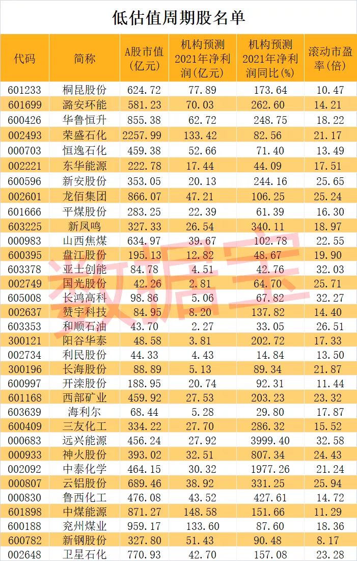 这33股中,按照机构一致预测净利润推算,新钢股份、桐昆股份、潞安环能、中煤能源、恒逸石化、开滦股份等6股折算市盈率低于10倍。