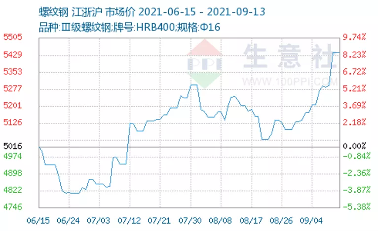 除不锈钢板外,钢铁其他品种价格也呈现上调趋势。据生意社,截止9月10日,江浙沪地区螺纹钢、线材价格较周初整体上涨,10日江浙沪地区HRB400螺纹钢均价约5442.22元/吨,较周初上涨3.33%约180元/吨;HPB300高线均价5722/元/吨,较周初上涨5.22%约284元/吨。