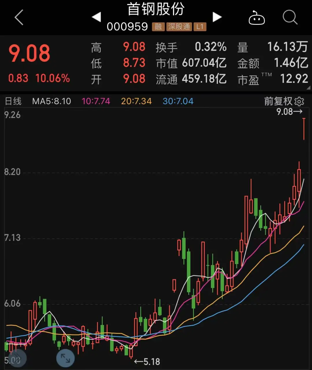 统计显示,A股市场中钢铁概念股共有36只,今日30只个股上涨,首钢股份涨停,广大特材上涨10.62%,宝钢股份、方大特钢、凌钢股份涨幅居前,分别上涨5.34%、4.90%、4.12%。