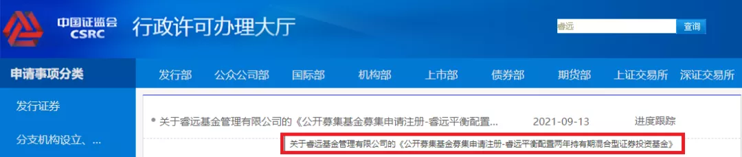 证监会网站显示,睿远基金于9月13日上报了一只名为睿远平衡配置两年持有期的混合型基金,目前处于接收材料状态。
