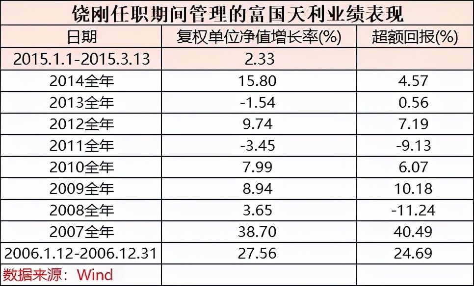 饶刚在富国基金的12年时间,也是债券基金从刚刚起步到崭露头角的十多年,经过两年多研究员生涯的打磨,饶刚于2006年1月12日正式接手富国天利增长债券基金,富国天利也是饶刚管理时间最长的一只基金,wind数据显示,直至2015年3月13日卸任基金经理,饶刚在管理富国天利期间任职期总回报159.62%,年化回报10.96%,位居同类基金前列。