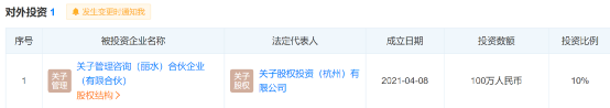 天眼查信息显示,关子私募基金目前有一个对外投资——关子管理咨询(丽水)合伙企业(有限合伙),注册资本1000万。钟睒睒则以900万持股90%,是大股东;关子私募基金以100万持股10%。