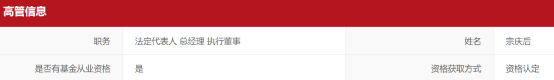 值得注意的是,宗庆后获得基金从业资格的方式为“资格认定”,虽然这意味着其并不是通过参加大家熟知的基金从业资格考试而取得,但也意味着,宗庆后的投资经验足以获取基金从业资格。此前,基金业协会曾出台政策,对从业年限、退出项目数量、管理资本量等条件符合要求并有相关材料证明及推荐人的私募基金管理人高管,无需通过考试,即可申请基金从业资格认定。