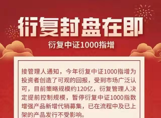 就在本周,有大型券商渠道发出公告,接管理人通知,今年衍复中证1000指增为投资者创造了可观的回报,受到市场广泛认可,目前策略规模约120亿,衍复管理人决定提前控制规模,暂停衍复中证1000指数增强产品新增代销募集,已在流程中及已上架的产品发行不受影响。
