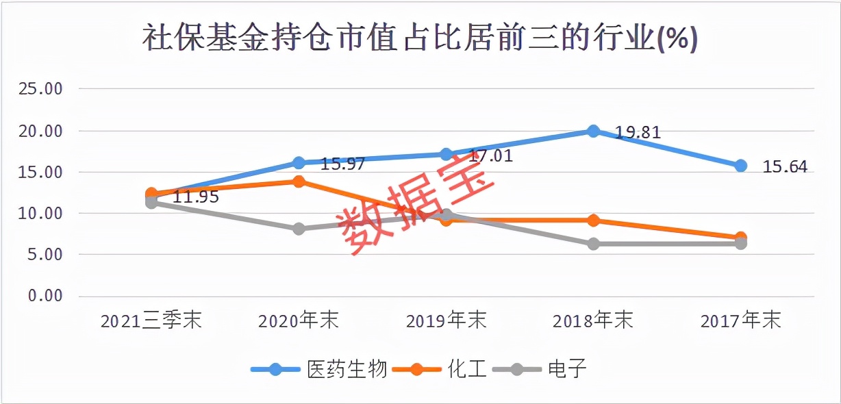 证券时报·数据宝统计显示,截至2021年三季末,社保基金持仓市值达到1734.31亿元,442只股票前十大股东名单中出现社保基金身影。往前追溯发现,社保基金连续11个季度持仓市值超过1500亿元,自2014年以来连续8年持股数量超过400只。最新持股市值超30亿元的有华鲁恒升、万华化学等,这些公司在2020年末社保基金的持仓中,也位居市值前列。