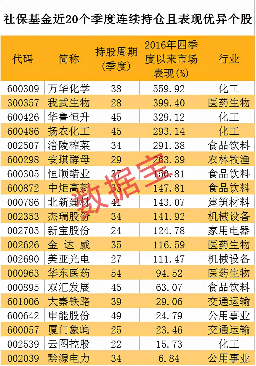 社保基金的“心头好”市场表现如何?数据宝统计显示,2016年四季度以来,截至最新收盘,31股平均涨幅超过100%,累计上涨股占比超八成,社保基金操作堪比股神。平均涨幅最高的是化工股,达到270%,其次的建筑材料、农林牧渔平均涨幅也超过2倍。社保基金擒拿了多只牛股,万华化学、我武生物、华鲁恒升股价累计涨3倍多,扬农化工、涪陵榨菜、安琪酵母累计涨幅超2倍。