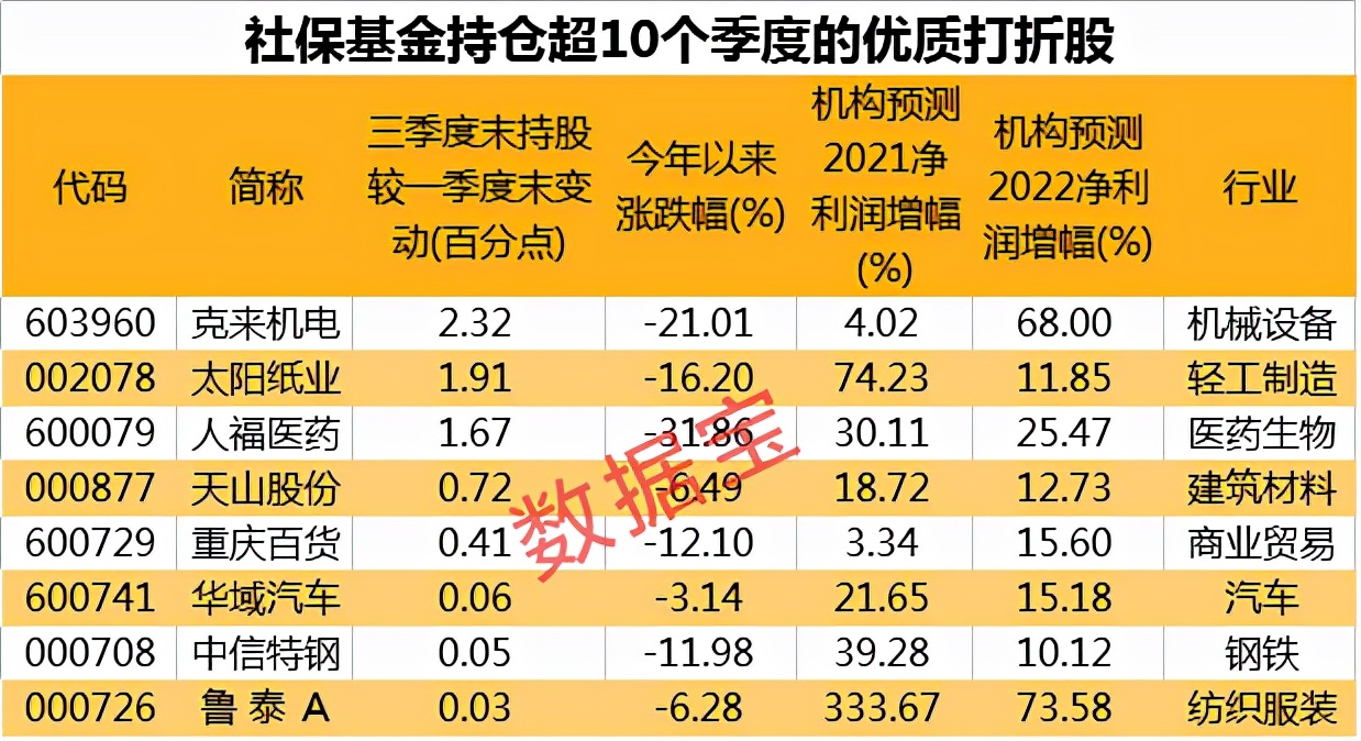 上述10只打折股中,除中国重汽、国恩股份外,其余8股2021年、2022年业绩保持持续增长。克来机电、太阳纸业及人福医药等3股社保基金持股较2021年一季末增加1个百分点以上。鲁泰A、中信特钢、华域汽车等业绩增幅有望保持在10%以上。