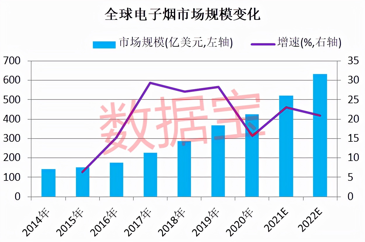 自2012年美国FDA禁止销售电子烟败诉,美国电子烟市场打开以来,全球电子烟市场销售额高速增长。艾媒咨询数据显示,2020年全球电子烟行业的市场销售额仍持续上升,达到424亿美元,同比增长15.6%,预计到2023年市场规模突破600亿元。