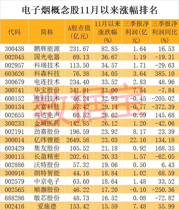 截至11月22日收盘,这些概念股11月以来平均涨幅20.04%,远超同期沪指。鹏辉能源、国光电器、科瑞技术、科森科技、电连技术等股涨幅较大。鹏辉能源累计涨幅82.85%排在首位,公司曾在互动平台表示,公司的小型锂离子电池在电子烟市场有不错的反响,客户有麦克韦尔等数十家。