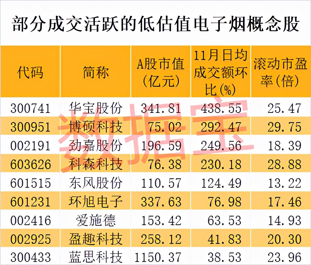 通常而言,在股价底部区间,成交量放大意味着有资金参与,短期内反弹概率较大。数据宝统计显示,11月以来超八成电子烟概念股日均成交额较上个月出现提升,在这些成交活跃度提升的股票中,9股目前滚动市盈率不到30倍,包括华宝股份、博硕科技、劲嘉股份、科森科技、东风股份等,这5股日均成交额环比上个月提升1倍以上。
