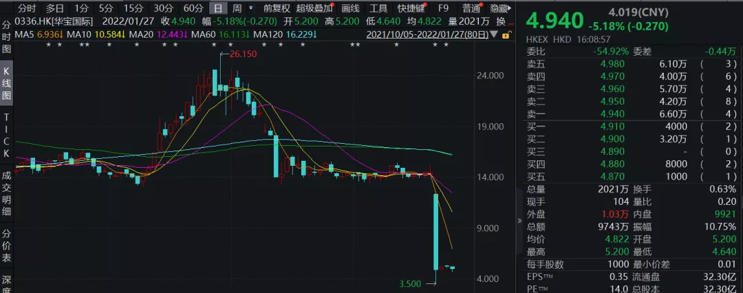 不过,受此影响,当日华宝国际开盘闪崩,盘中一度跌超75%。截至当日收盘,华宝国际跌幅为66.53%,收于4.86港元。