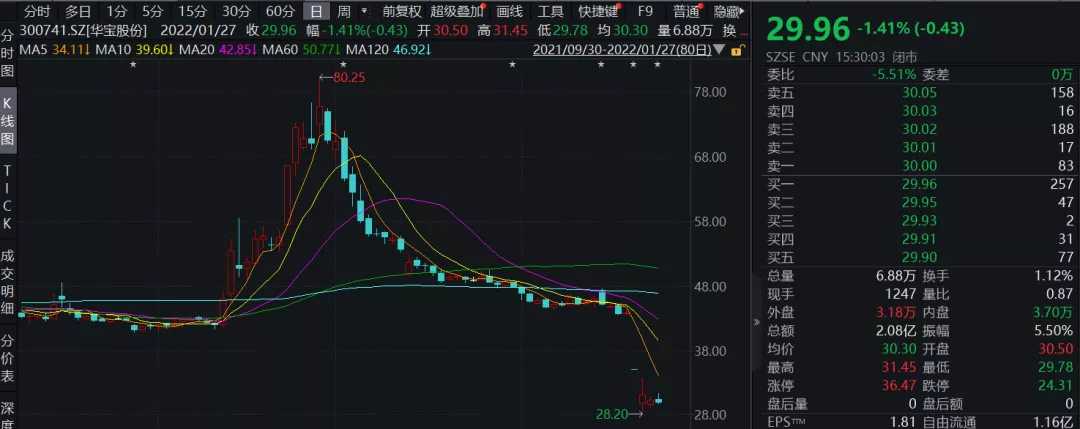 而就在24日,华宝股份发布早间公告称,近日收到耒阳市监察委员会立案通知书,其决定对公司实际控制人朱林瑶的违法问题立案调查。受该消息影响,当日,华宝股份直接20cm跌停,次日继续下跌,盘中一度跌超19%。而港股华宝国际当日则一度大跌超75%。