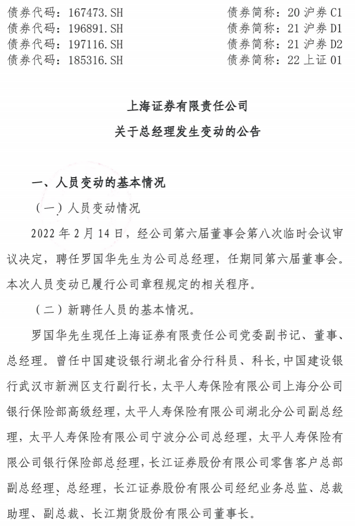 2月15日晚间,上海证券发布公告,聘任罗国华为公司总经理,任期同第六届董事会。上海证券表示,本次人员变动已履行公司章程规定的相关程序。