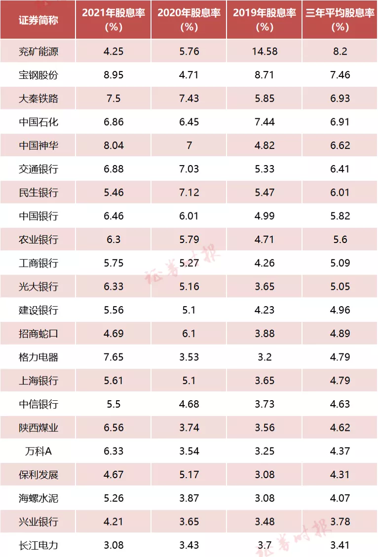 具体来看,记者筛选近三年来股息率均在3%以上的大盘股,可以看出,煤炭、钢铁、银行等板块相关股票股息率较高,其中,兖矿能源近三年平均股息率达8.2%,宝钢股份达7.46%,大秦铁路、中国石化、中国神华、交通银行等均在6%以上。