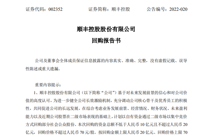 根据回购计划,本次顺丰控股计划在未来6个月内,以不超过70元/股价格,斥资回购10亿元至20亿元,对应可回购股数将在1428.57万股至2857.14 万股,约占公司目前总股本的0.29%至0.58%。本次回购股份的资金来源为公司自有资金,采用以集中竞价方式回购;公司董事会薪酬与考核委员会将尽快 拟定员工持股计划或股权激励计划草案,提交董事会、股东大会审议。