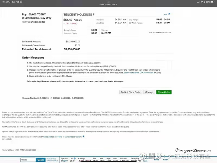2月28日,在腾讯控股逼近前期最低价之际,知名投资人段永平再度出手,发文称,低过我上次买的价钱了,明天再买点。在评论中,段永平附上了自己的下单记录,设置价格为53.5美元价格,预计成交总金额为535万美元。