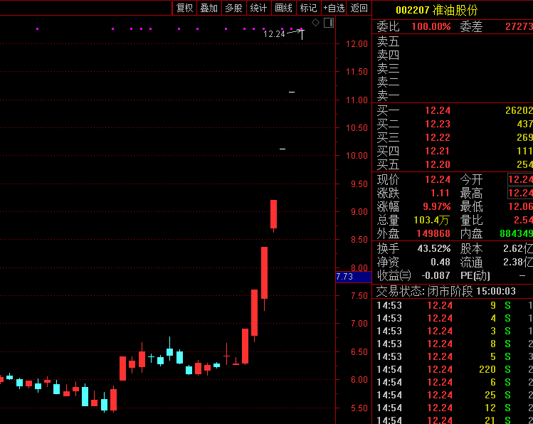3月4日,准油股份(002207)再度呈现出涨停走势,这也是该股自2月24日以来连续收出的第7个涨停板。截至3月4日收盘时止,准油股份报于12.24元,上涨1.11元,涨幅为9.97%。2月24日至今,准油股份的累计涨幅已经达到94.9%。