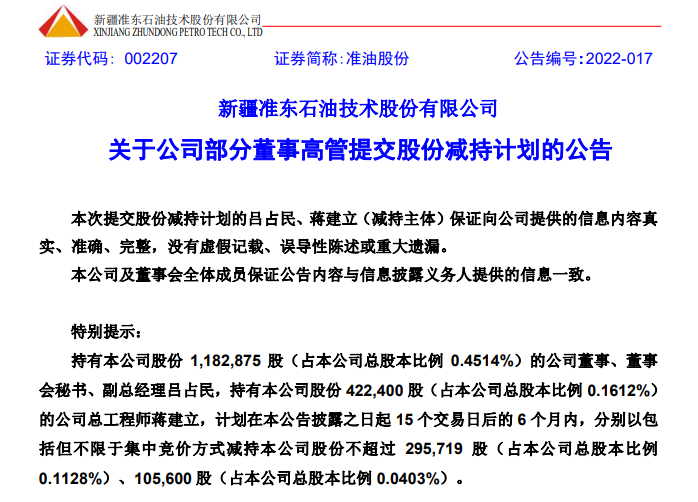 据准油股份3月4日晚同步披露的公告,持有公司股份118.29万股(公司总股本比例 0.4514%)的公司董事、董事会秘书、副总经理吕占民,持有公司股份 42.24万股(占公司总股本比例 0.1612%)的公司总工程师蒋建立,计划在公告披露之日起 15 个交易日后的 6 个月内,分别以包括但不限于集中竞价方式减持公司股份不超过 29.57万 股(占公司总股本比例0.1128%)、10.56万股(占公司总股本比例 0.0403%)。吕占民、蒋建立本次拟减持的原因均为个人资金需求。