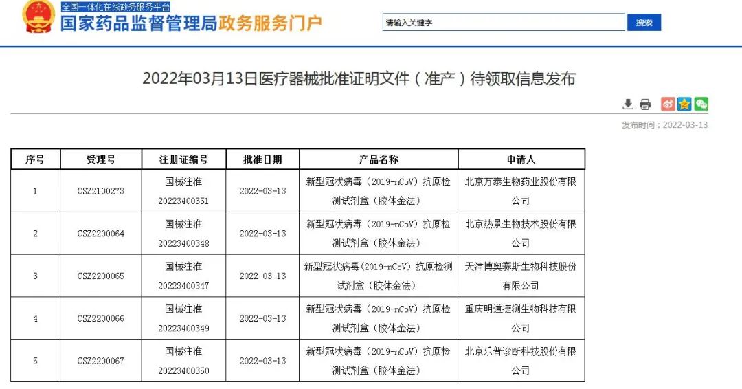 11日,国务院应对新型冠状病毒肺炎联防联控机制综合组印发《关于印发新冠病毒抗原检测应用方案(试行)的通知》显示,经研究,决定在核酸检测基础上,增加抗原检测作为补充。随后,国家药监局网站发布的医疗器械批准文件(变更)待领取信息显示,北京华科泰生物技术股份有限公司、南京诺唯赞医疗科技有限公司、北京金沃夫生物工程科技有限公司、深圳华大因源医药科技有限公司、广州万孚生物技术股份有限公司的5款新冠抗原检测试剂盒通过了药监局的注册信息变更。