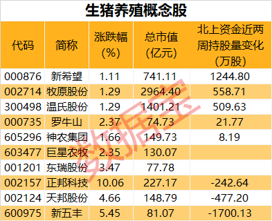 数据宝统计,本月北上资金净买入多只猪产业概念股,以区间成交均价计算,牧原股份获北上资金加仓3.08亿元,新希望、温氏股份获北上资金加仓1亿元以上。