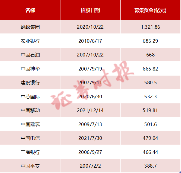 A股历史新股实际募集资金前11名公司