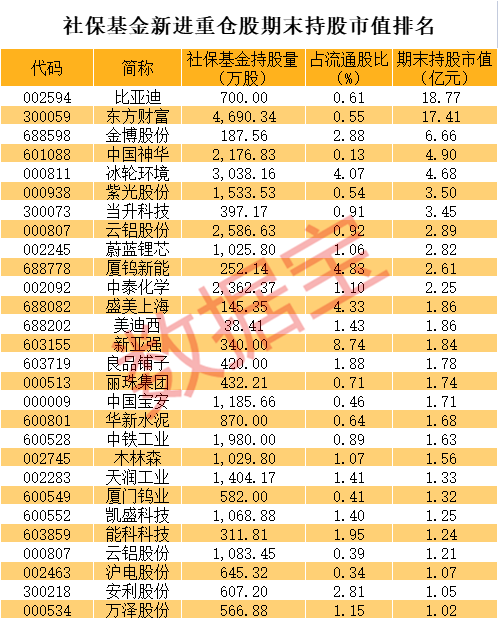 新进重仓股方面,持仓市值最高的是比亚迪,全国社保基金一一四组合新进700万股,持仓市值超过18亿元。“券茅”东方财富获全国社保基金一零八组合重仓4690万股,期末持股市值超过17亿元。