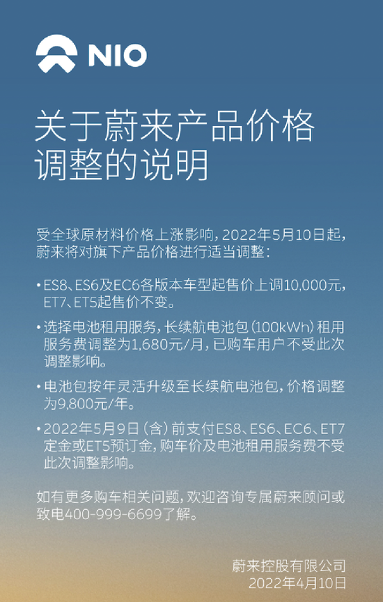 新能源汽车今年以来陆续提价,蔚来是其中动作相对较晚的。