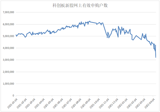 从2021年科创板新股申购户数趋势来看,去年下半年新股出现一波“破发潮”后,科创板打新人数由600万户左右减少至500万户左右,近期随着新股“破发潮”再现,科创板打新热情骤然降温,打新人数由年初的500万户左右减少至目前320万户,近200万科创板投资者放弃打新。