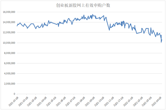 纵观创业板新股申购人数也可以看出,投资者申购创业板新股的热情也在下降。去年下半年新股“破发潮”背景下,创业板新股申购户数由1500万余户直接减少至1400万户左右,到今年年初减少至1300万户左右,而近期新股“破发潮”再现,创业板新股申购的投资者也骤然下降,最低逼近1000万关口。