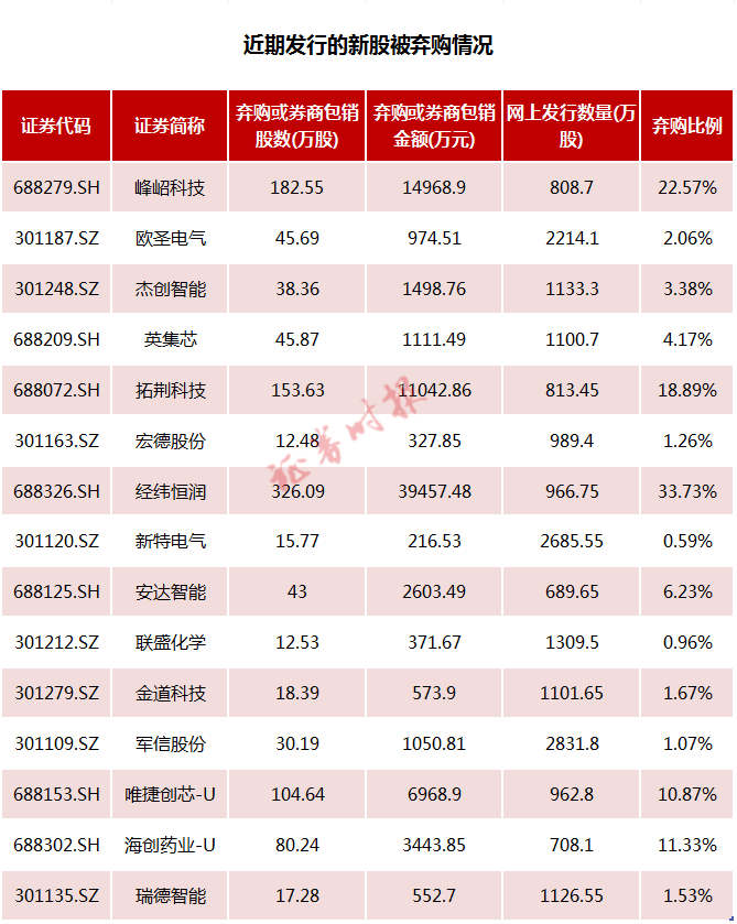 除了申购新股的投资者数量大幅减少外,中签投资者弃购的现象也愈演愈烈。科创板企业经纬恒润被网上投资者弃购3.95亿元,拓荆科技、峰岹科技被网上投资者弃购的金额也在1亿元以上。