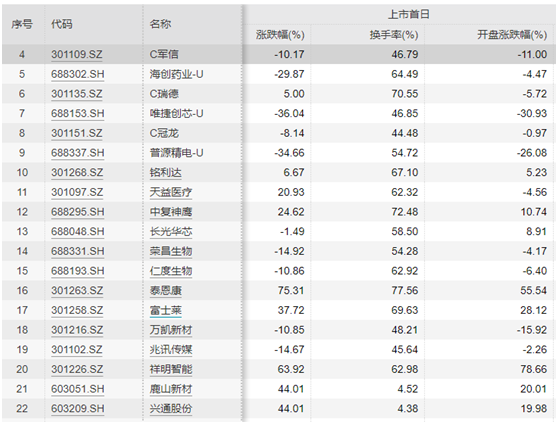 此外,军信股份、海创药业-U、冠龙节能、普源精电-U等多只近期上市的新股也出现破发现象。