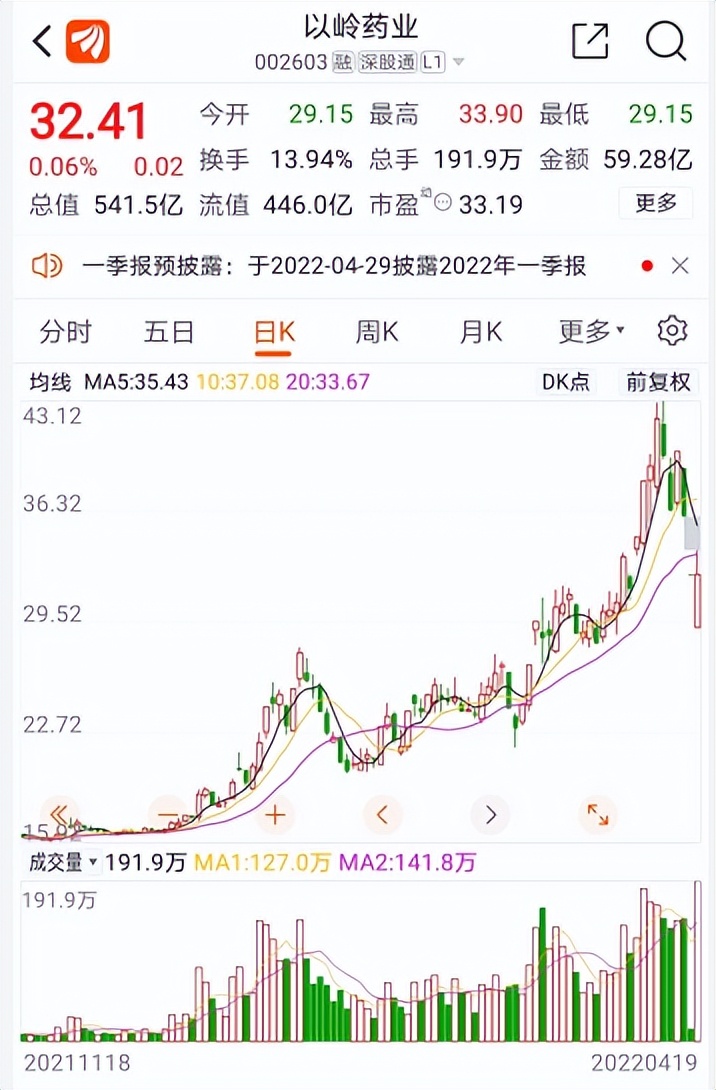 4月19日,以岭药业跌停开盘后震荡反弹,收盘微红,最终收于32.41元/股,微涨0.06%。