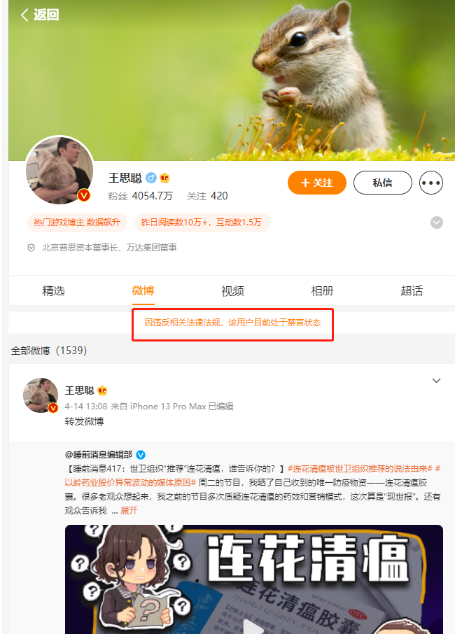 怼以岭药业的王思聪被禁言