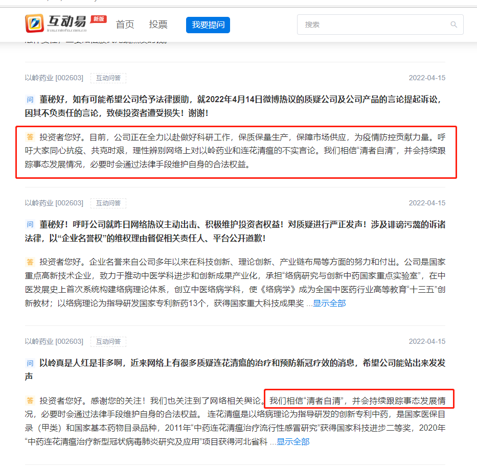 不仅如此,以岭药业还在投资者互动平台呼吁投资者理性辨别网络上对以岭药业和连花清瘟药品的不实言论。以岭药业称,该公司相信“清者自清”,并会持续跟踪事态发展情况,必要时会通过法律手段维护自身的合法权益。