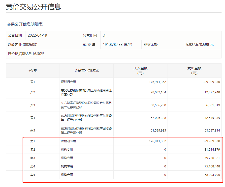 4月15日,以岭药业盘中跌停,报收35.99元,市值一日蒸发超67亿元,成交额超54亿元;4月18日开盘,以岭药业一字跌停,封单超10万手,截至上午11时,股价报32.39元,市值蒸发超60亿元。连续两个交易日跌停后,以岭药业累计市值蒸发超过120亿元。