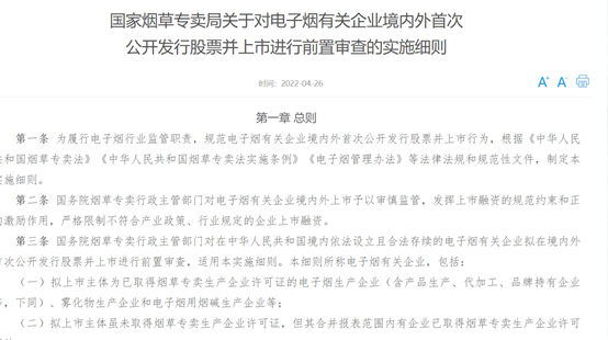 4月26日,国家烟草专卖局正式发布《关于对电子烟有关企业境内外首次公开发行股票并上市进行前置审查的实施细则》(以下称《实施细则》),旨在规范电子烟有关企业境内外首次公开发行股票并上市行为。