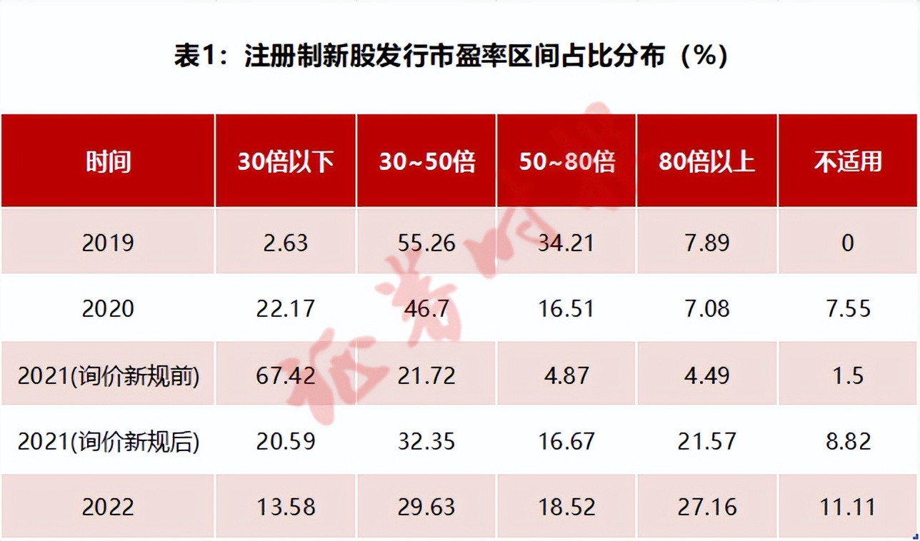 从表1显示的各年份注册制下新股发行市盈率分布占比来看,有如下三大典型特征。