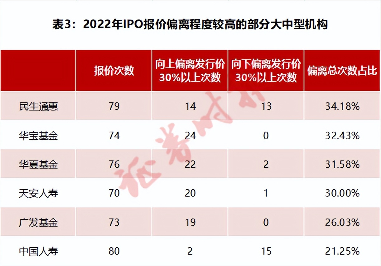 数据显示,在申报量较大的公募基金、保险和资管机构中,华宝基金、华夏基金、天安人寿、广发基金等偏好报高价,今年以来较发行价偏离幅度超过30%的报价约占3成(表3)。在高比例破发的新股报价中,几乎都能看到上述几家机构报高价的身影。例如上市首日破发17%的经纬恒润-W,华夏基金、广发基金和华宝基金在初步询价阶段的报价分别高出发行价51%,62%和79%。