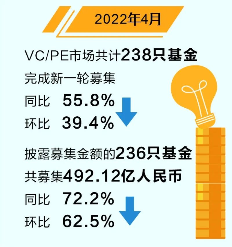 清科研究中心数据统计,2022年4月VC/PE市场共计238只基金完成新一轮募集,同比下降55.8%,环比下降39.4%;披露募集金额的236只基金共募集492.12亿人民币,同比下降72.2%,环比下降62.5%。