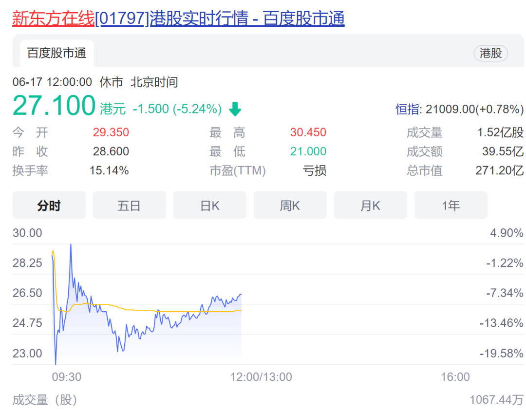在连续暴涨后,新东方在线今日剧烈震荡,先是开盘直线下挫,盘中一度跌逾26%,随后直线反弹,盘中一度涨逾7%,再然后又逐渐下滑,截至收盘跌5.24%。