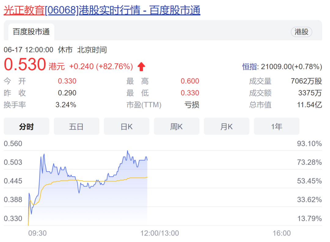 而续新东方在线暴涨之后,香港教育股再现单日翻倍“神股”。光正教育昨日暴涨50%,今日再度高开高走,盘中最高一度上涨逾106%,两日合计最多上涨209%。天立教育盘中也一度暴涨逾61%,成实外教育最高上涨近33%。