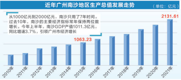 海港经济蓬勃发展也带来了地区发展的“加速度”。2021年南沙地区生产总值突破2000亿元,从1000亿元到2000亿元,南沙只用了7年时间。过去10年,南沙的主要经济指标常年保持两位数增长。