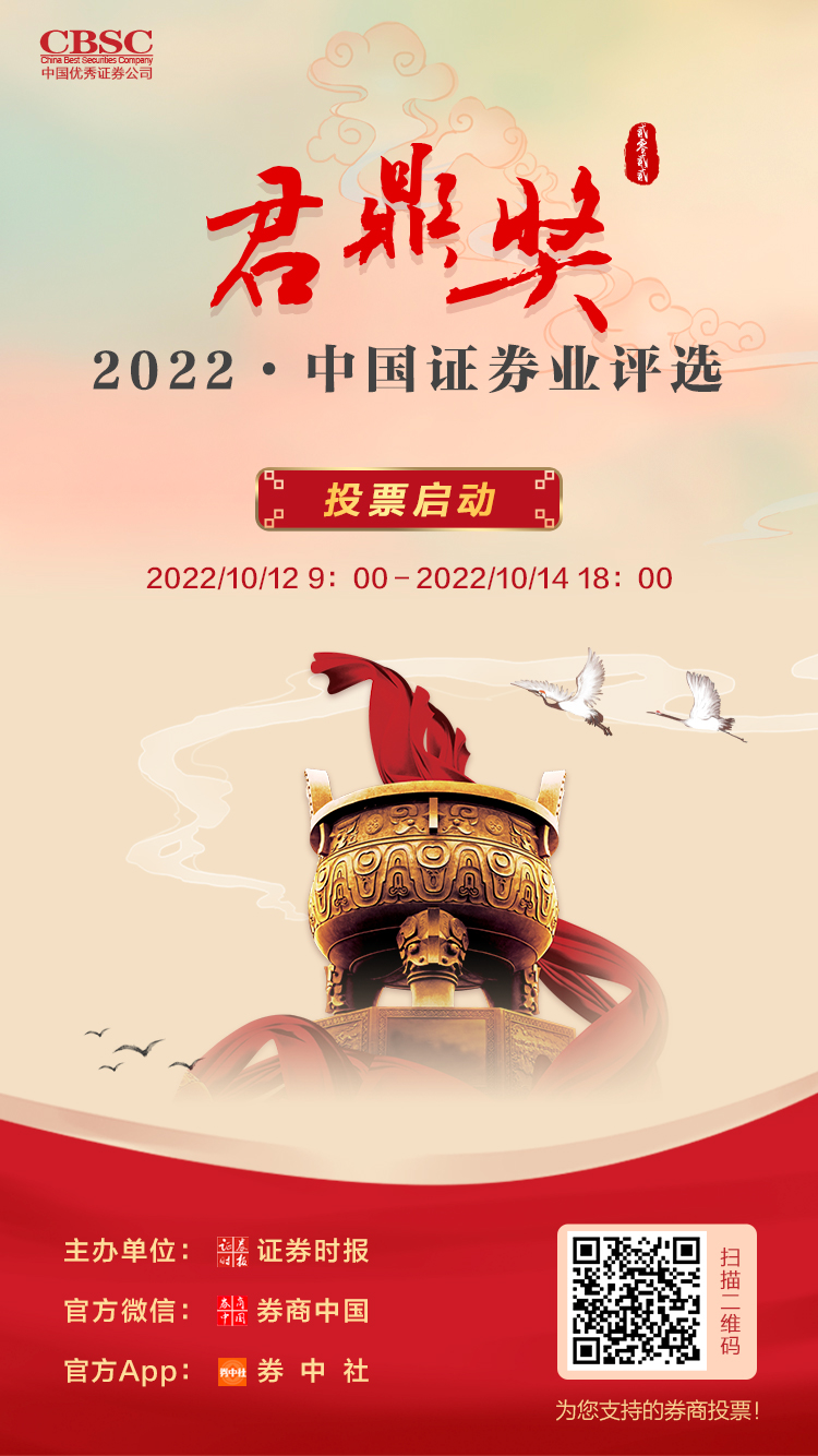 10月12日09:00,“2022中国证券业君鼎奖评选”活动正式启动网络投票程序。网络投票在评分体系中占比20%,请您投出宝贵的一票!