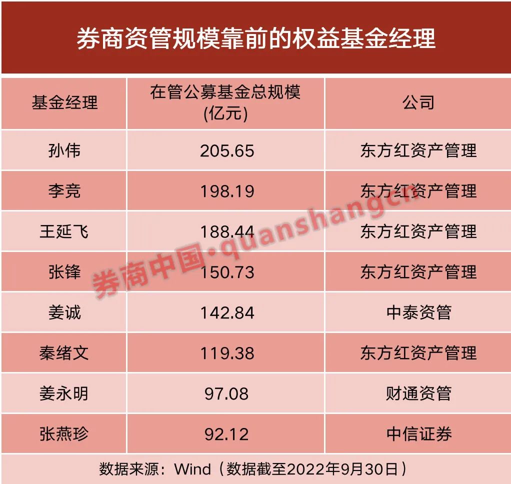 券商中国记者梳理发现,截至今年三季度末,券商资管权益基金经理中,共有6名基金经理规模超过百亿。其中5名基金经理来自东方红资产管理,分别是孙伟、李竞、王延飞、张锋、秦绪文,此外中泰资管的姜诚也规模超过百亿。